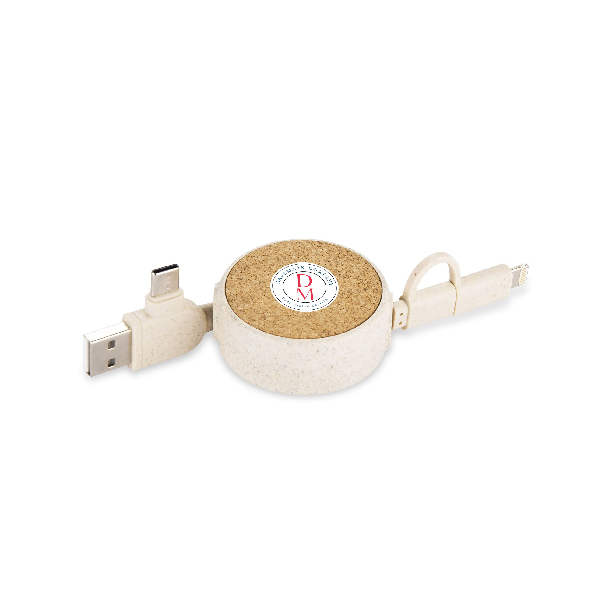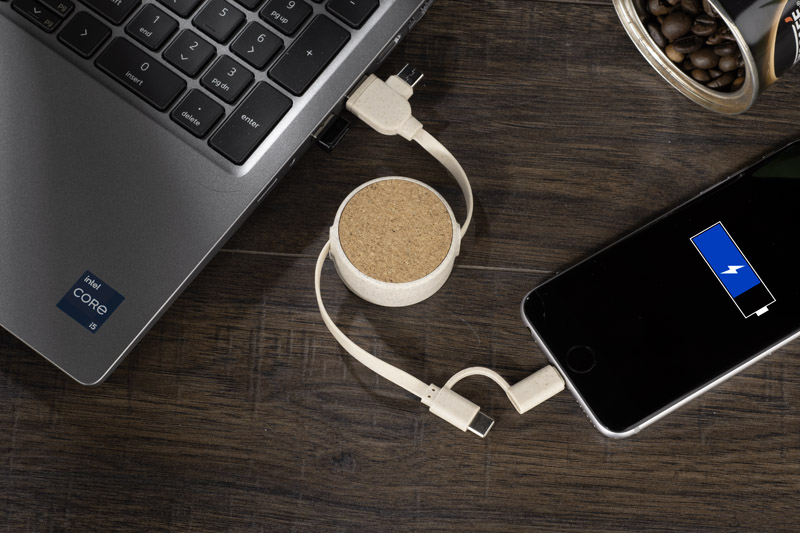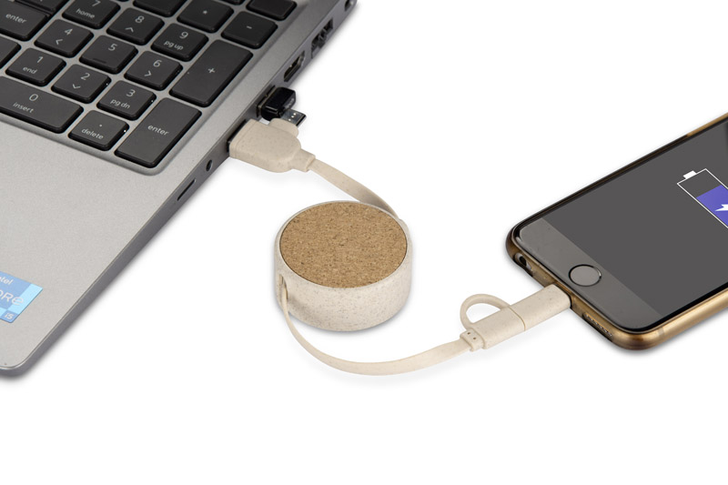 The SLOPI charging cable combines natural materials with functionality. Made from cork and wheat straw plastic, it features USB, 2 x USB-C, and Lightning connectors, ensuring versatility and convenience. Its coiled design makes it easy to store, while the natural look gives it a unique character. Ideal for companies looking to complement their branded wireless chargers in bulk with a practical and eco-friendly accessory, making it perfect as a promotional gadget.