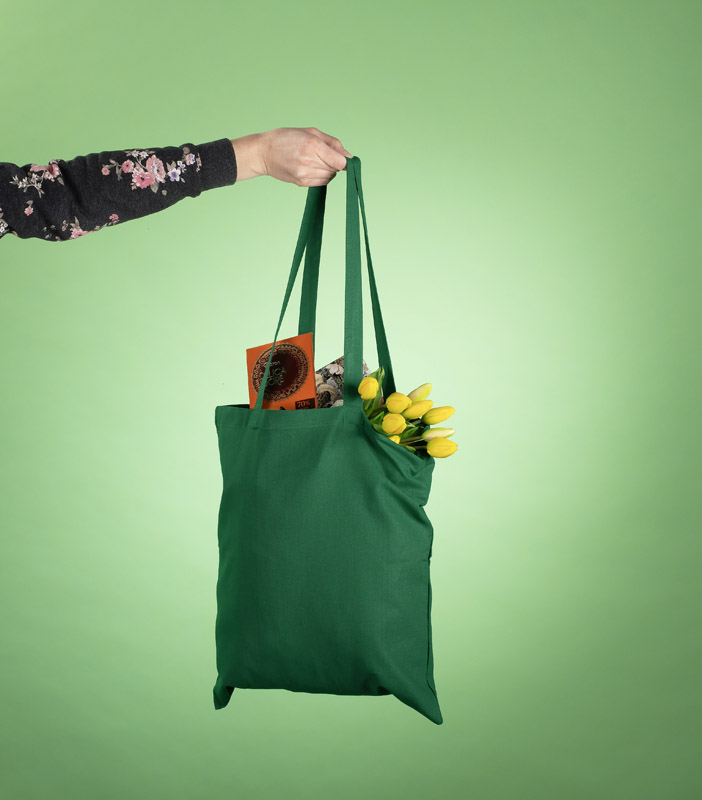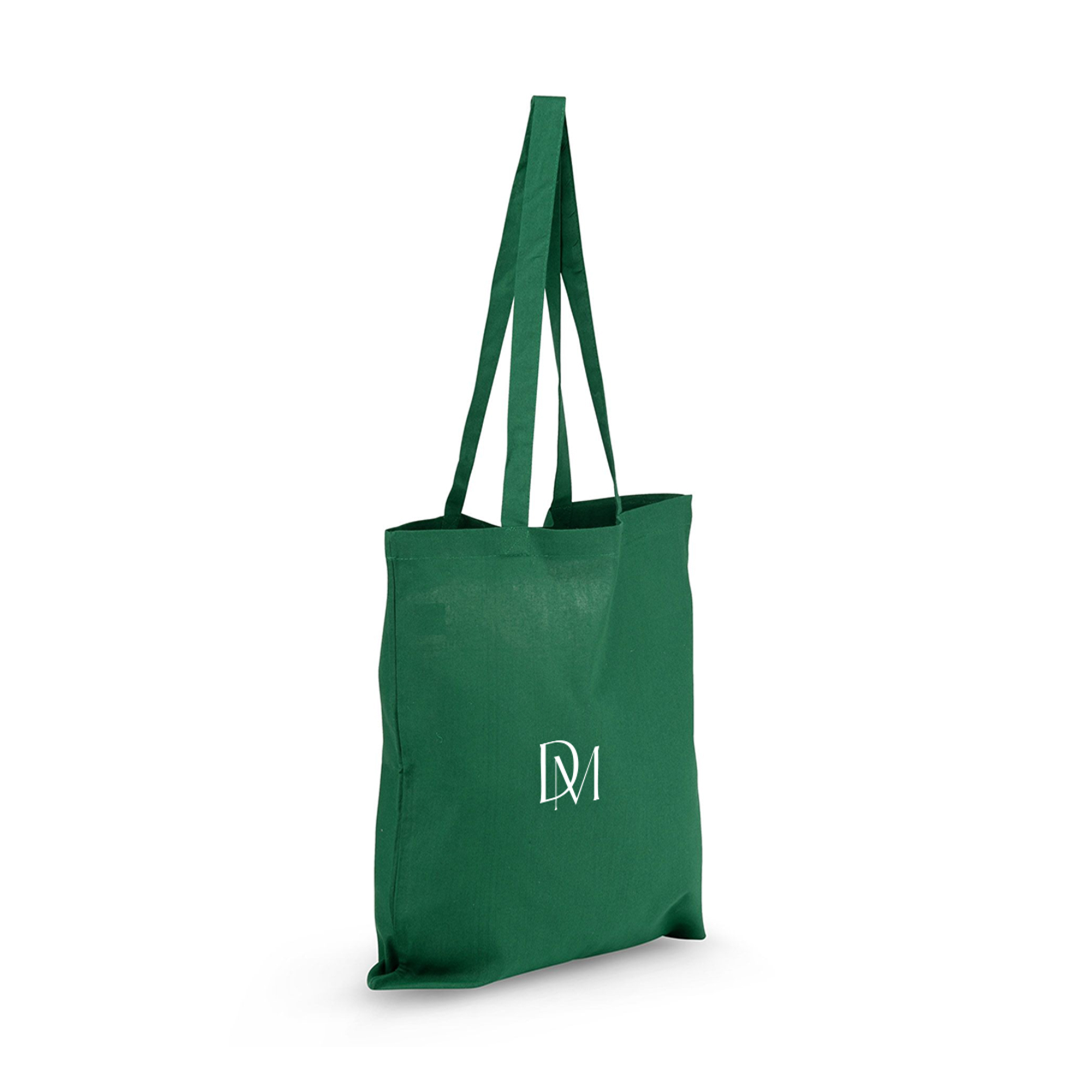 This eco-friendly green cotton bag (370 x 410 mm, handle length 690 mm) is made from durable cotton. Lightweight and reusable, it offers both style and practicality.