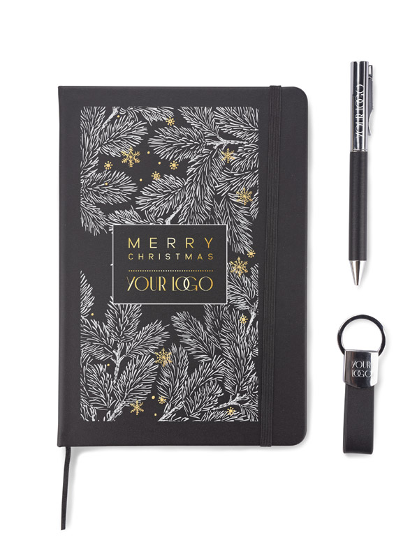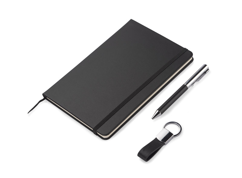 The notebook measures 145 x 210 x 13 mm, the pen 132 x ⌀10 mm, and the key ring 62 x 20 x 9 mm. The whole set comes in a sleek black sleeve, perfect for gifting.