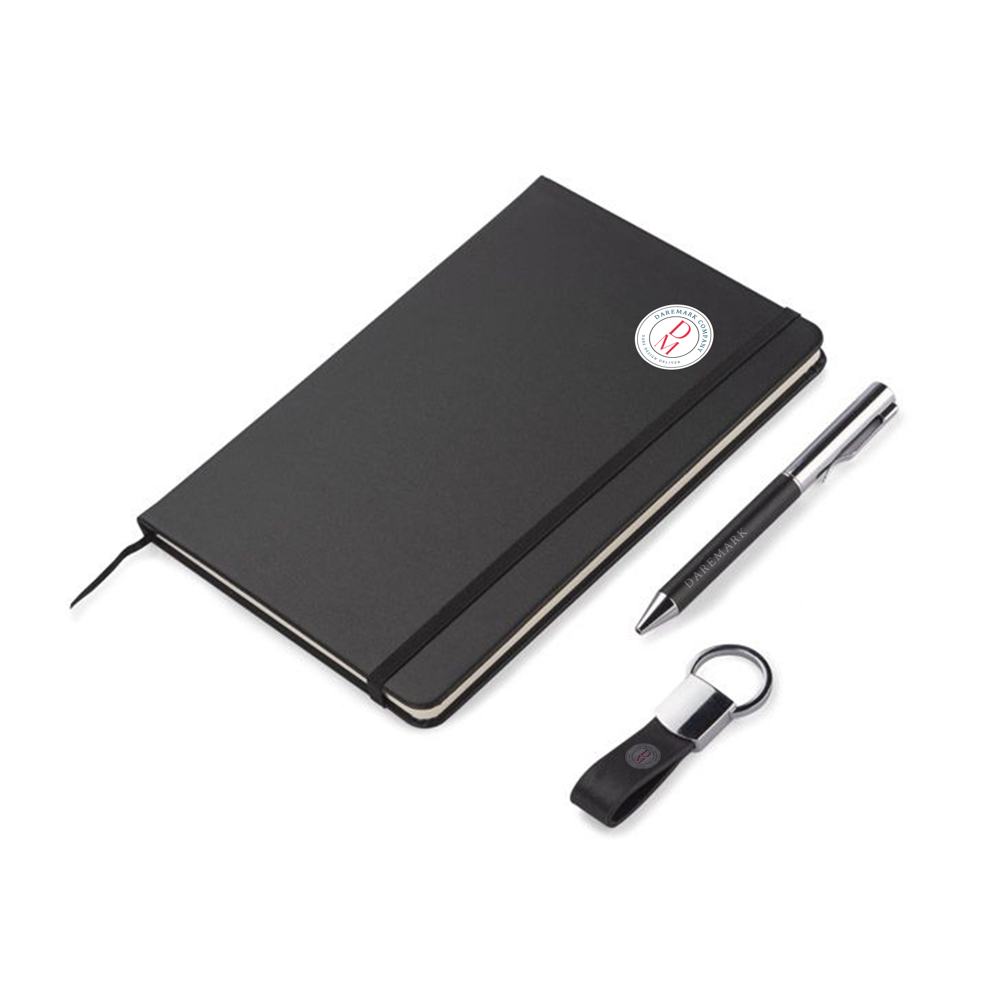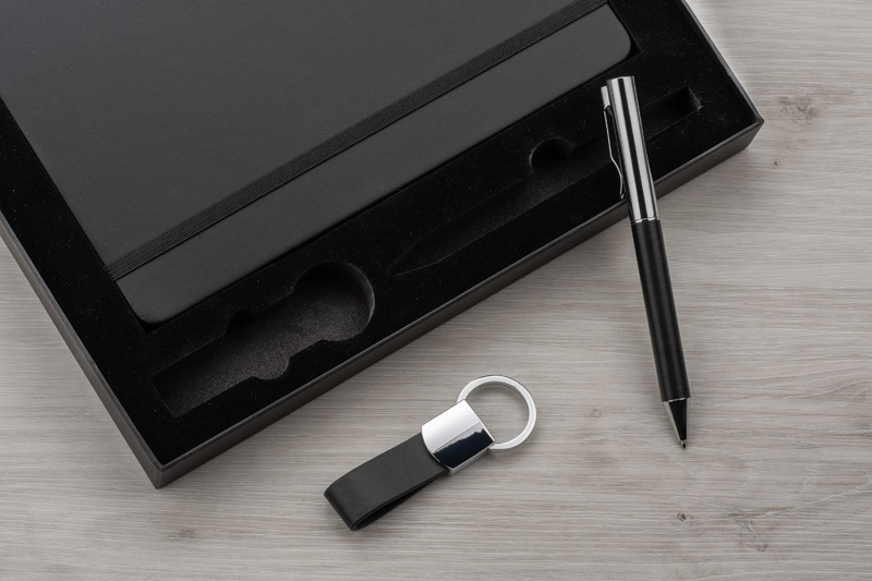 The PROBIZ set consists of a notebook, a pen, and a key ring. The notebook features smooth pages made of stone paper in A5 format, perfect for high-quality writing experiences. The key ring combines metal and leather-like (PU) materials for durability and style. The pen comes with a blue refill for smooth writing. This elegant set is packed in a tasteful black box, making it an excellent choice from a trusted custom notebook supplier.