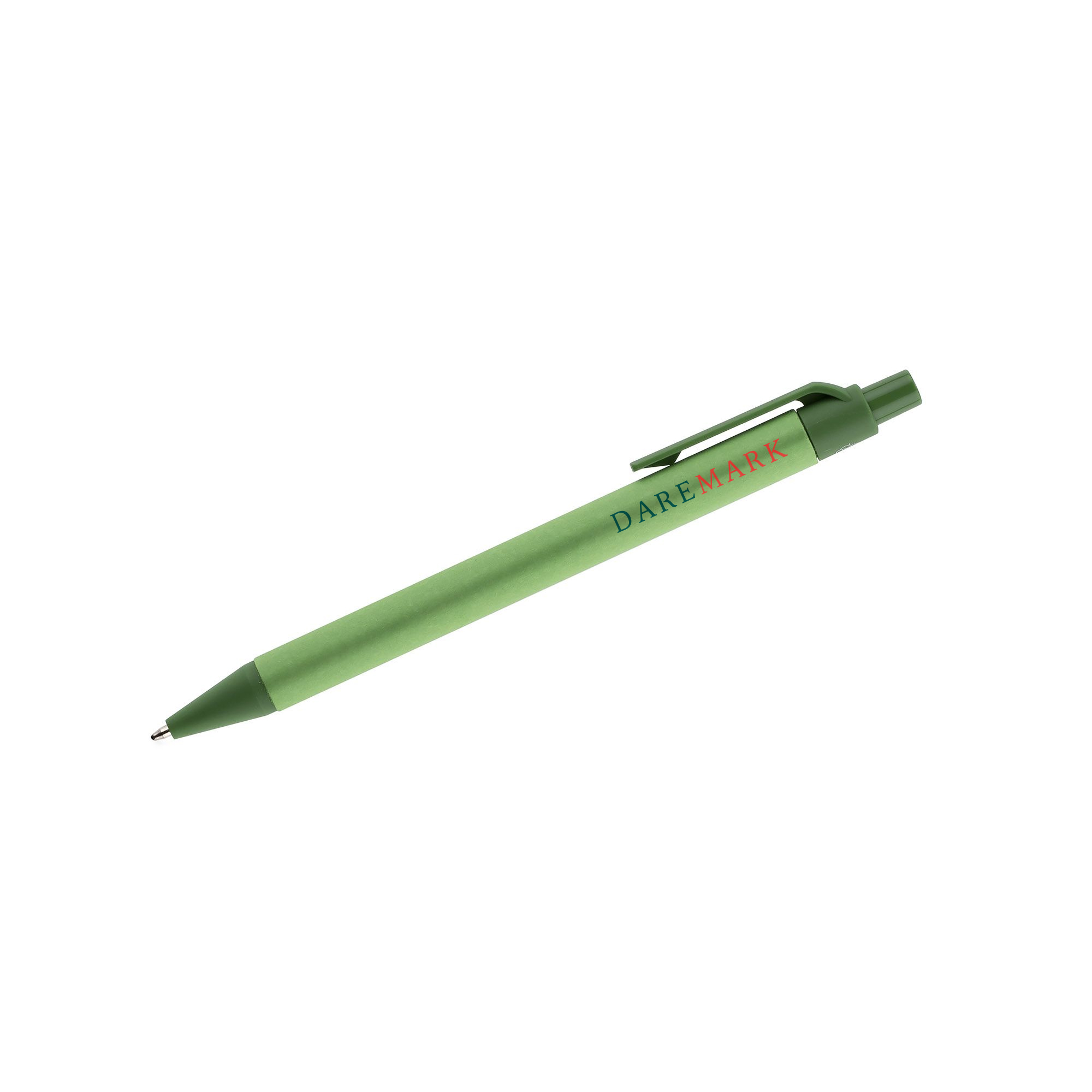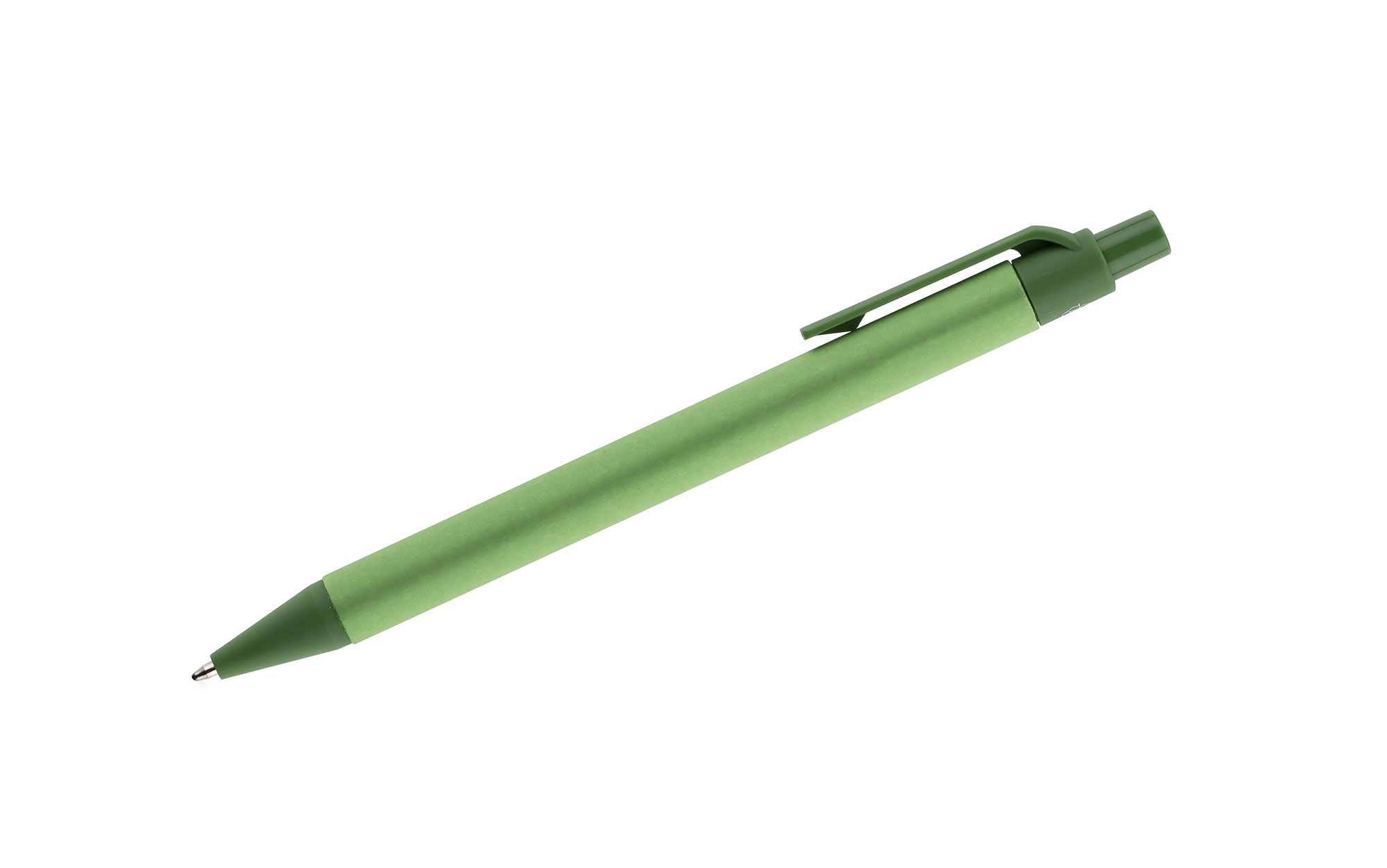 This green ballpoint pen features a durable plastic and paper body with dimensions of 139 x ⌀10 mm. It comes in Pantone colors 2269 C (body) and 7742 C (clip), offering a stylish and eco-conscious design.