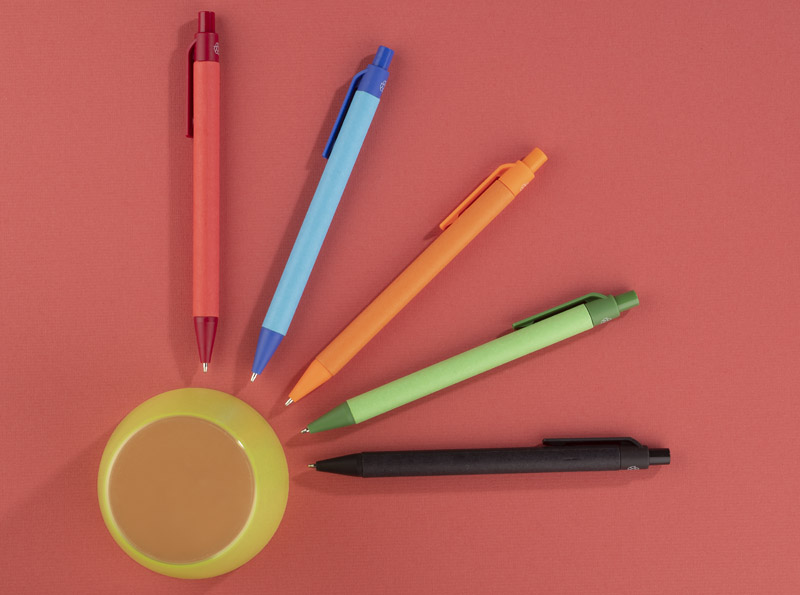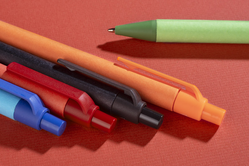 The POLI ballpoint pen is a popular gadget made from environmentally friendly materials. Its body is crafted from colorful recycled paper, while the clip and tips are made from fully recycled PLA plastic derived from corn. This pen is perfect for those who want to avoid increasing environmental pollution when using office accessories. It features an automatic ballpoint mechanism with a blue refill. Ideal as eco corporate accessories and sustainable office gadgets.