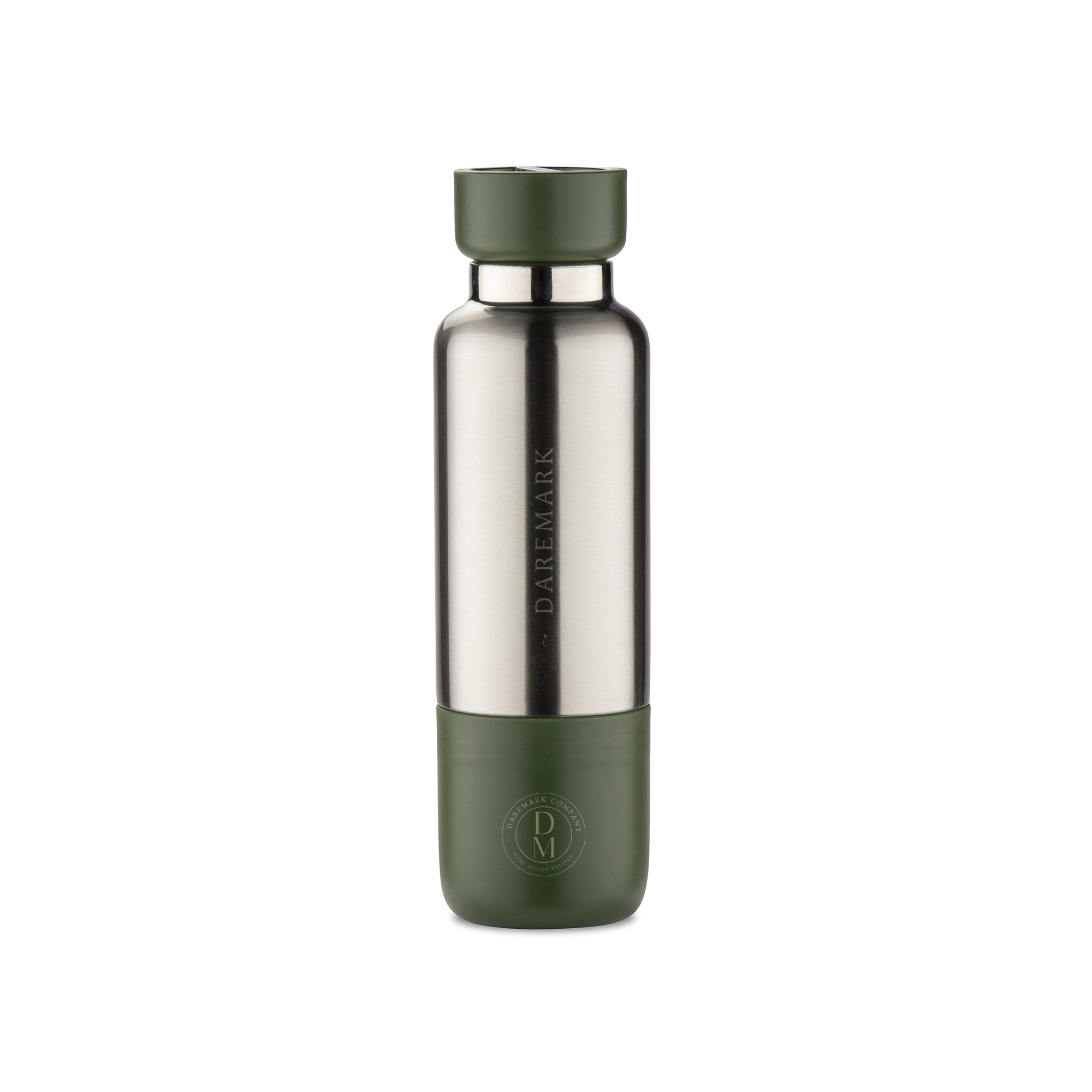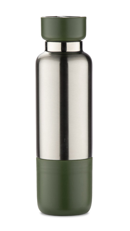 The RON Thermal Bottle is a stylish and practical choice for corporate drinkware gifts. Made of durable metal and plastic, it features a 500 ml capacity, BPA-free construction, and a 12-month warranty. Its olive color (Pantone 5747C) and sleek ø 76 x 260 mm dimensions make it ideal for active users. Designed with a carabiner, dual lanyards, and a detachable base that doubles as a cup, it’s a standout in branded water bottles.