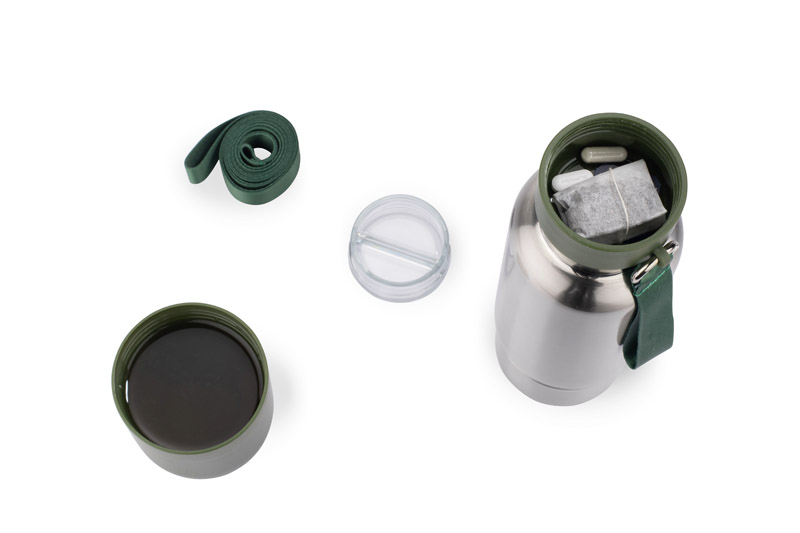 The RON thermal bottle is the perfect blend of style, function, and sustainability—ideal for corporate drinkware gifts or everyday use. Designed for active lifestyles, this branded water bottle includes a carabiner and two adjustable lanyards for versatile carrying. Whether you’re hiking, training, or commuting, it’s built for comfort and convenience. The innovative plastic base unscrews to become an extra cup, preventing tongue burns and offering a smoother drinking experience. Plus, a smart compartment in the lid stores tablets or supplements with ease. Crafted from durable, sustainable materials, the RON bottle is a proud part of our eco-friendly drinkware line—perfect for environmentally conscious brands and professionals. Make hydration effortless while showcasing your brand with this practical, stylish bottle. Ideal for gifting, it’s a great way to leave a lasting impression in today’s eco-aware corporate world.