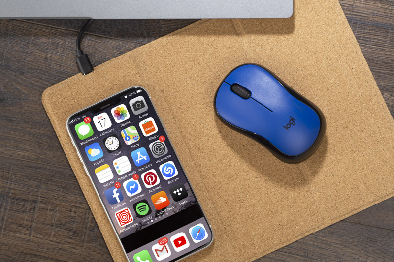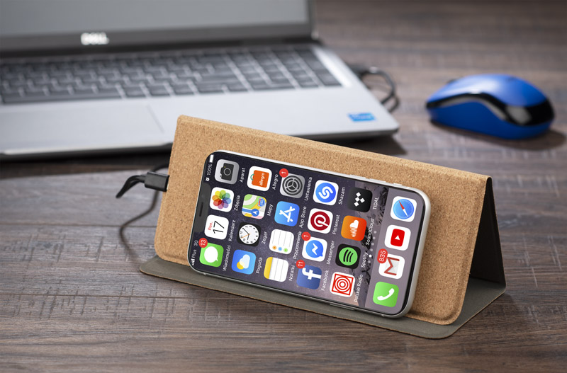 LEVORA is a foldable induction charger made of cork and fabric, perfect for charging smartphones, watches, or headphones. Its compact 265 x 205 x 3 mm design makes it easy to carry anywhere.